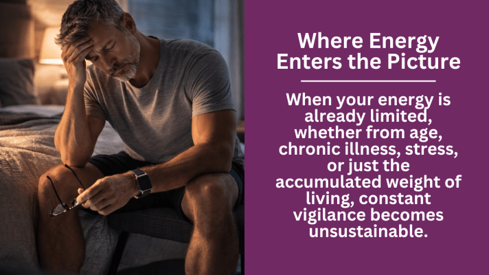 When your energy is already limited, whether from age, chronic illness, stress, or just the accumulated weight of living, constant vigilance becomes unsustainable. Exhaustion lowers your emotional resilience. It makes uncertainty louder. It convinces you that you must push harder when what you actually need is margin.