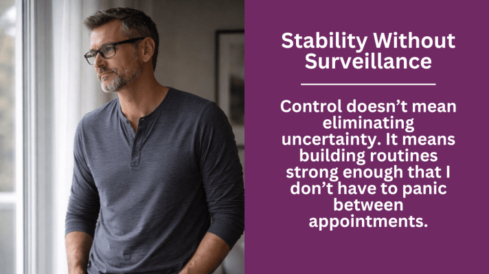 Control doesn’t mean eliminating uncertainty. It means building routines strong enough that I don’t have to panic between appointments. It means doing what’s required — and then stepping back. Letting the numbers exist without interrogating them every night. Letting my body move without assuming it’s collapsing.